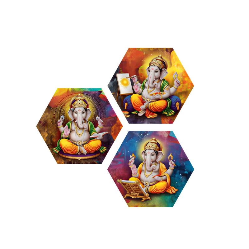 3 Piece Lord Ganesha Hexagon Wall Art Decoration Religious Art for Positivity UV Textured Spiritual Decor for Living Room, Home Temple and Office Paintings