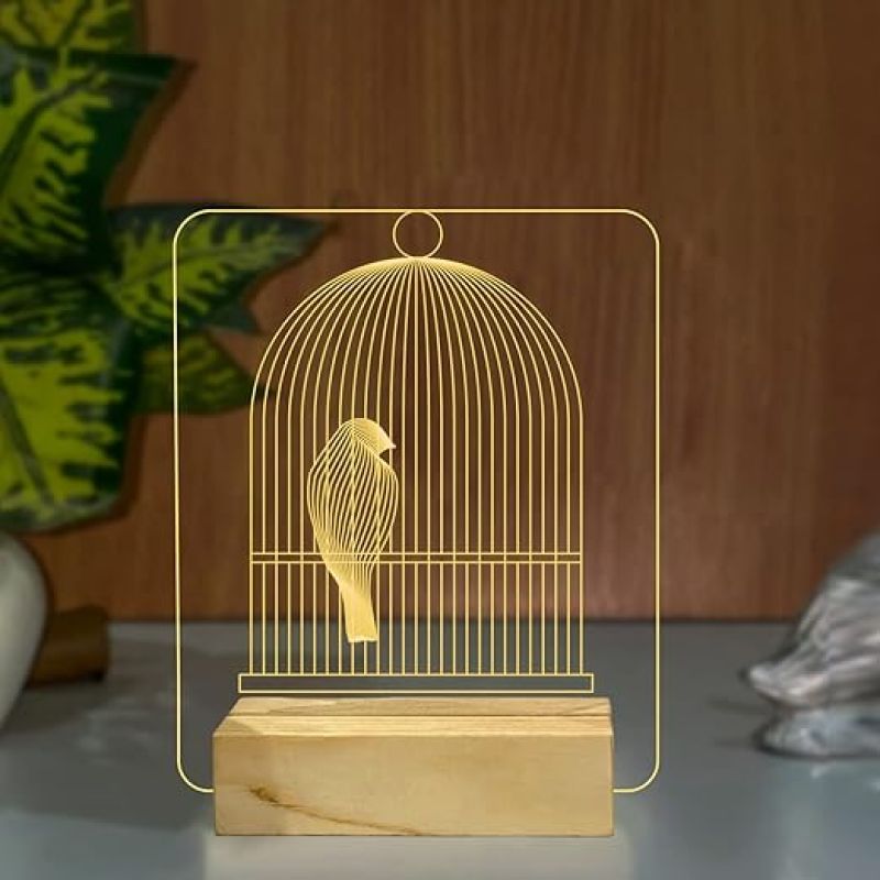 3D Illusion Bird cage Night lamp with Warm White Color Home Office Decor Light Wooden Base
