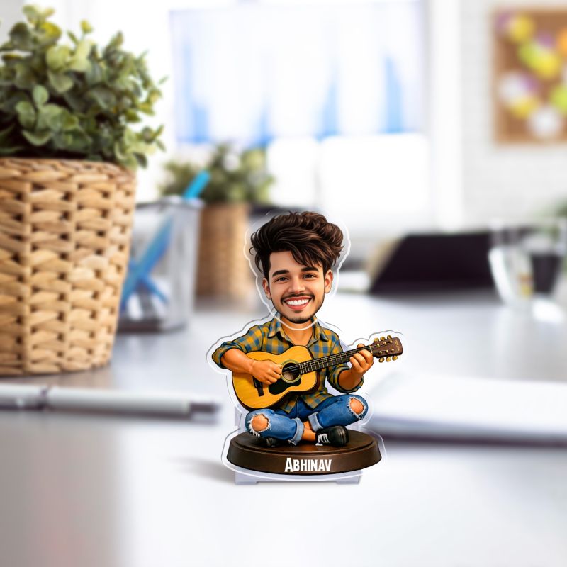 Personalized Bobblehead Caricature with Guitar, Custom Name Stand Home Tabletop Decor Battery Powered Moving Head Feature Gift for Guitar Lover