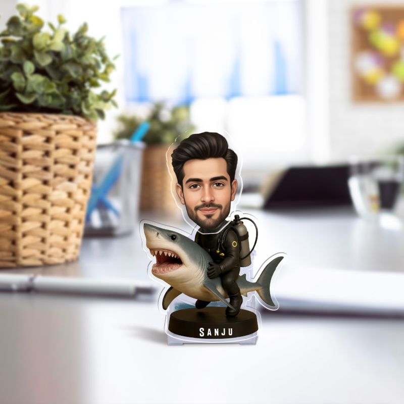 Personalized Bobblehead Caricature with Shark Rider Design, Solar Powered with Shaking Head for Car Dashboard Figurine Funny Car Decor