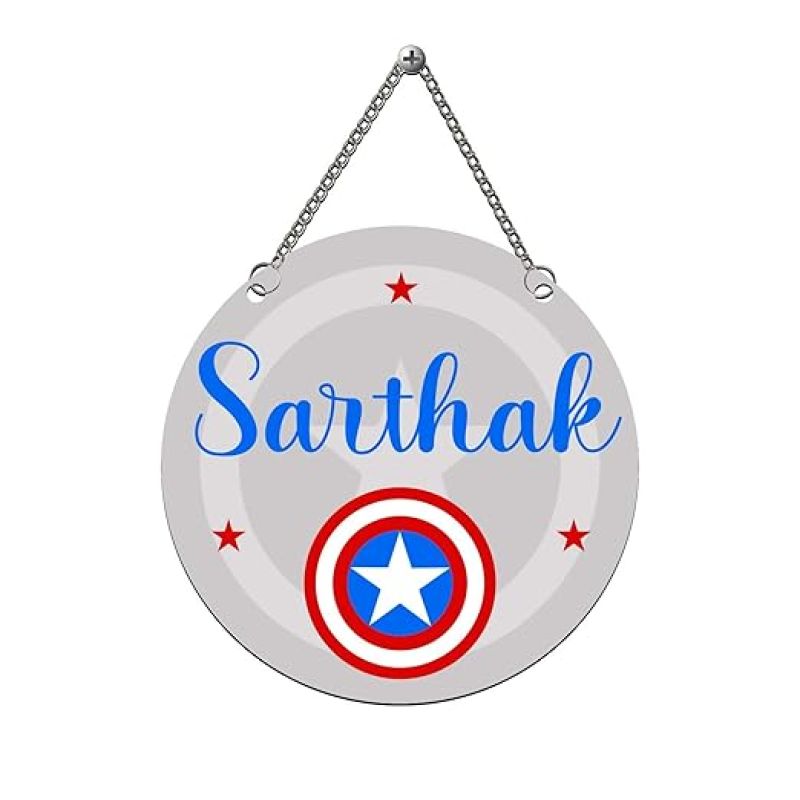 - Captain America–themed personalized wall hanging perfect for kids’ rooms and play areas