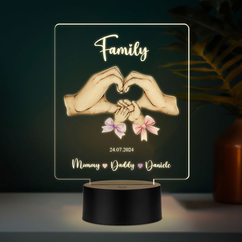Personalized Family LED Night Light, Heart Hands Design, Customizable with Names and Date, Gift for Mom Dad Warm White Light