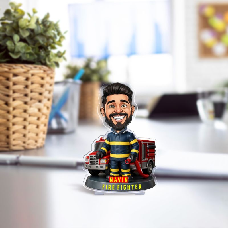 Personalized Firefighter Theme Caricature with Fire Truck Design Custom with Face Cutout & Name Truck Dashboard Decor Gift for Firemen Solar Powered Moving Head
