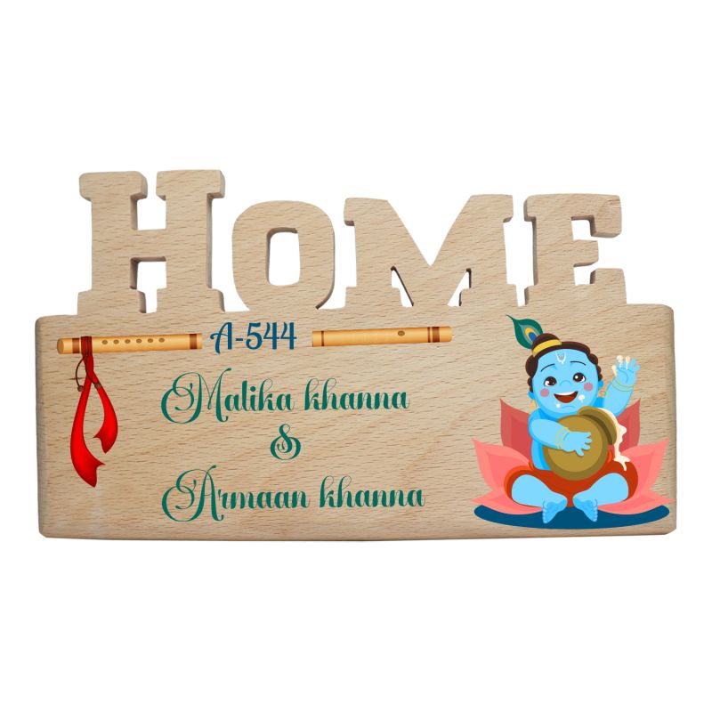 Personalized Lord Krishna Theme Wooden Name Plate For Home Entrance, Flat & Office Laddu Gopal Wall Decor for Main Door Custom With Name & Flat Number