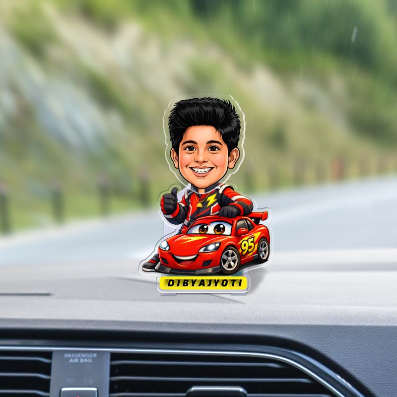 Personalized Racing Car Theme Bobblehead Caricature Standee for Car Dashboard Decor Birthday Gift for Son, Brother, or Boyfriend Solar Powered Moving Head Feature
