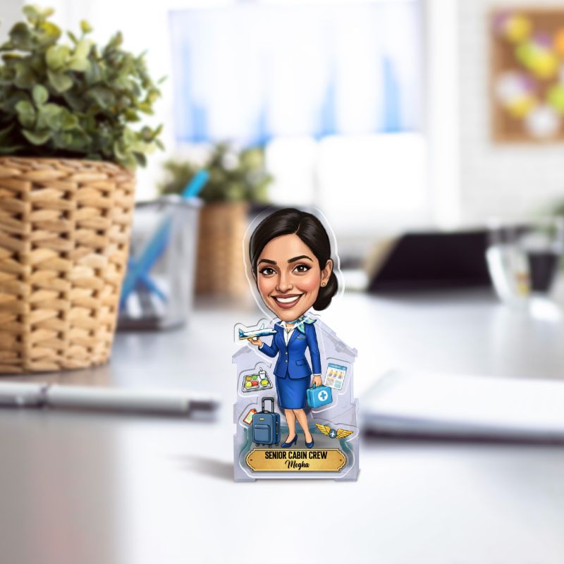 - ???? Fun Caricature Style – Features a playful caricature-style face with a professional cabin crew uniform, creating a memorable and eye-catching desk accessory.