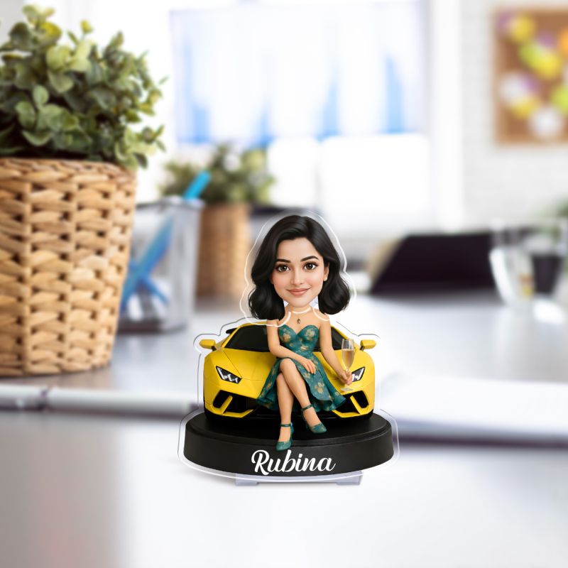 Personalized Yellow car leady Booblehead Caricature for Girls Battery Powered Moving Head Feature | Birthday Gift for Daughter, Sister, Mom & Lady Boss | Tabletop Decor