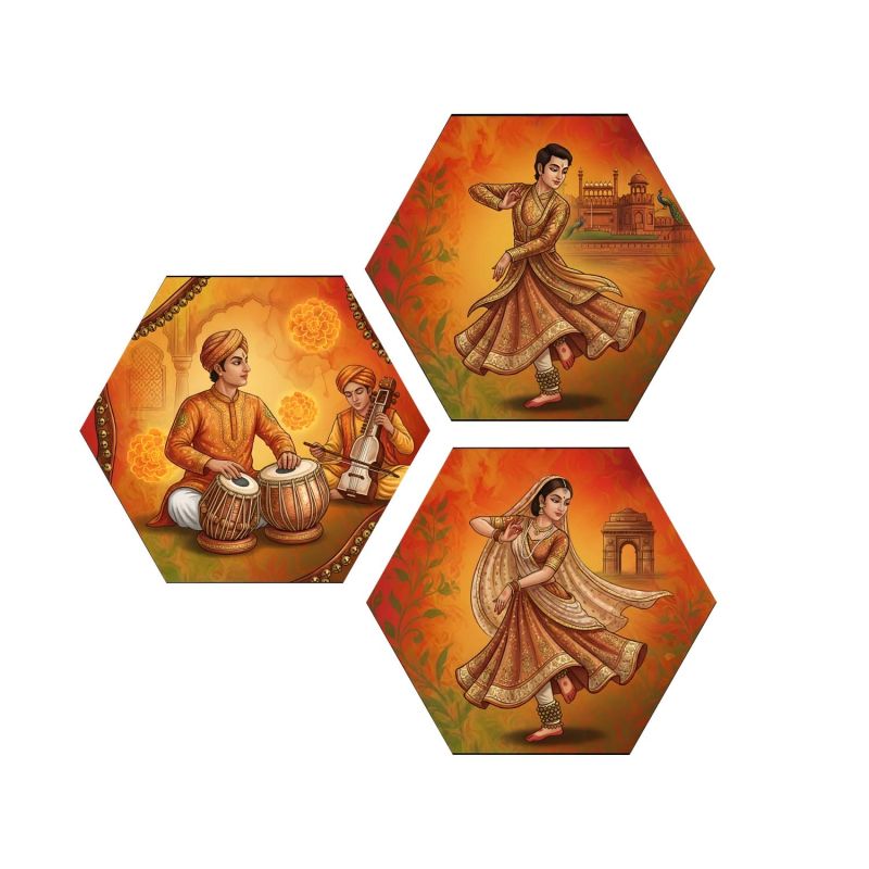 Set of 3 Hexagonal Shape Indian Classical Kathak Dance Wall Art Decor Traditional Musician and Dancer Theme Decor for Living Room, Office, and Cultural Wall Decoration